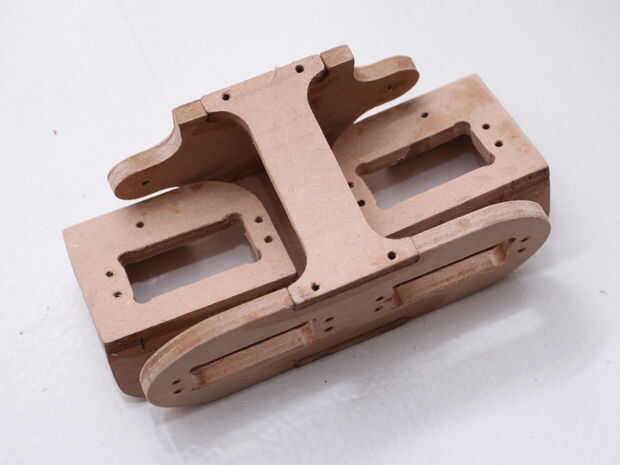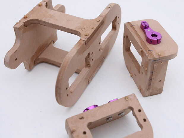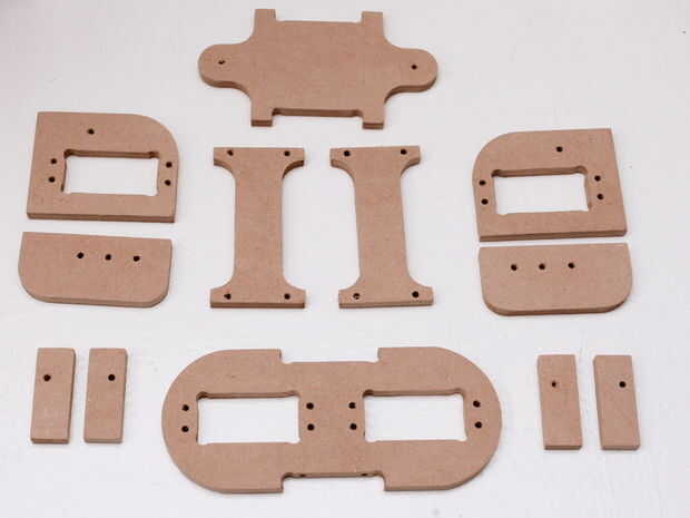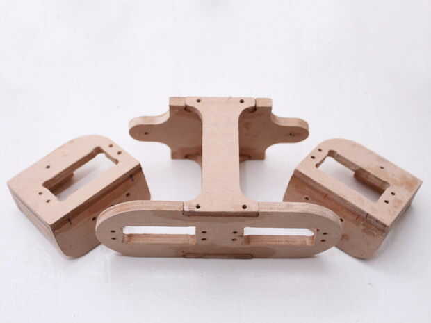 Las piezas eran muy rígidas una vez pegado, pero decido pegar en algunas espigas para la fuerza adicional. Una vez que las piezas se pegan perforaron algunos pequeños agujeros en perpendicular junto a piezas e inserta palillos de pegamento (fósforos o palillos son ideales, perfore los agujeros en consecuencia). Cabe señalar sin embargo, MDF no le gusta tener sus bordes perforados en y le gusta dividir; Tengo alrededor de esto perforando con brocas sucesivamente más grandes, de 2mm a 2,5 mm a 3mm.