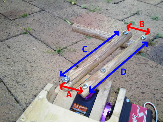 Como comentamos en la fase de planificación, los brazos deben formar un paralelogramo, es decir que la barra de "antebrazo" siempre permanecerá paralela a una línea imaginaria trazada entre el eje del servo y del punto de pivote de la barra paralela. El acoplamiento paralelo efectivamente convierte la rotación de nuestro servo "codo" en un movimiento de adelante/atrás en la barra del antebrazo.