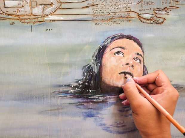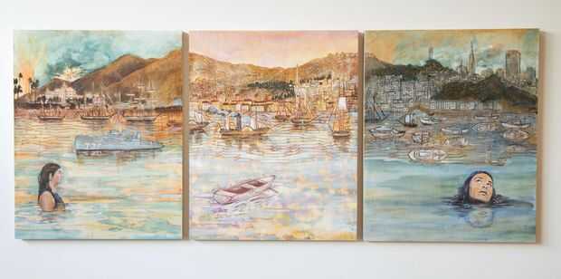 Tríptico de paisaje marino, 2015 (acrílico y lápiz sobre paneles de madera grabado a láser)