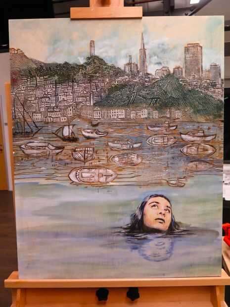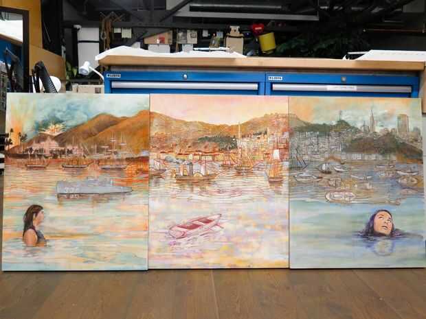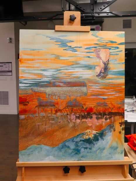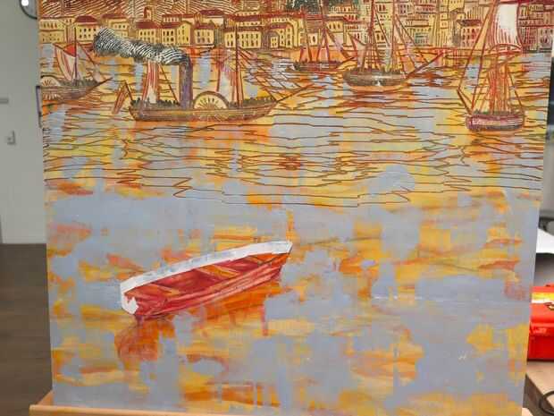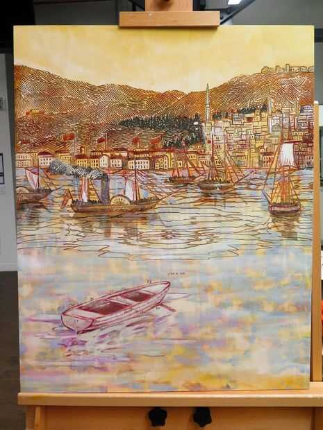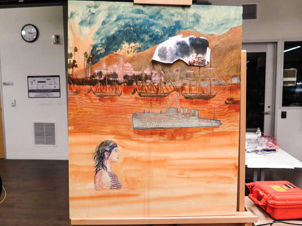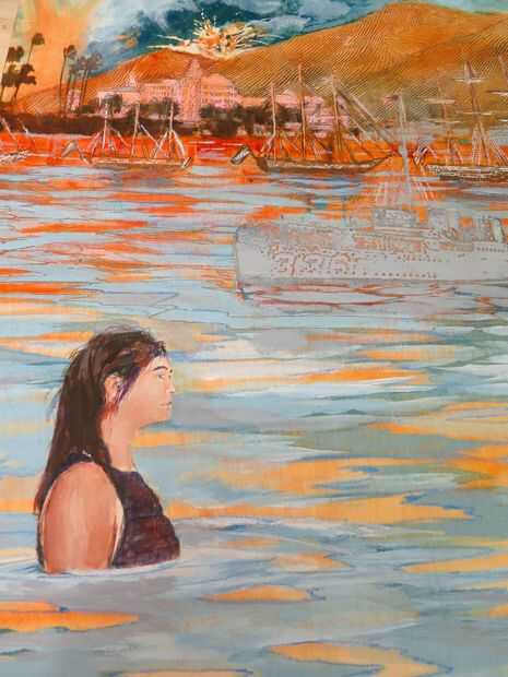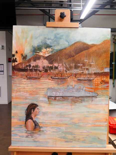 Hay mucha ambigüedad en esta gama de colores es alegre y puede ser decorativo. Creo que el acorazado es el indicador más evidente del peso de las historias que se cuentan en estas. De lo contrario, para notar lo que está sucediendo históricamente necesita ya sabe la historia de estos lugares, o relacionarse personalmente con el simbolismo. Hay pistas para el público conducir aunque en otros pensamientos. Algunos barcos están llenos de refugiados, algunos están vacíos. Hay sólo un hotel en Hawaii y el paisaje no es exuberante y verde pero socarrado. Las olas no son realistas pero con dibujos y borrosa hacia fuera. El agua es poco profunda y profunda, la marea es ambos adentro y hacia fuera. Estos son algunos de los dibujo y opciones de pintura que añadir más complicaciones al trabajo dependiendo de las experiencias personales del espectador.