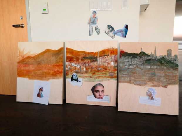 Quería que todos los tres paneles diferentes aunque misteriosamente el mismo debido a los dibujos, por lo que pintado por separado. Incluso cuando quería usar un color similar en dos paneles diferentes, confunde lo desde cero para cada pintura en lugar de utilizar el mismo color para ambos. De esta manera sería cercano pero no exacto. Los colores también refieren un poco a los principales lugares y tiempos del grupo. Hawaii tiene un montón de elementos de WWII y brillante fuego y explosiones, Smyrna tiene más ahumado pero todavía fuego, y SF es un poco más moderna ciudad gris y ahumada con sólo un toque de fuego amarillo que viene a través. Sin embargo, el cielo nublado de humo en San Francisco es pintura directamente con la vieja foto del incendio del terremoto de 1906. Es, también, los colores de un marco de tiempo de transición no identificados, con puesta de sol o el crepúsculo. Estos son todos inciertos tiempos del día no sólo años.