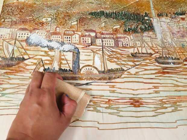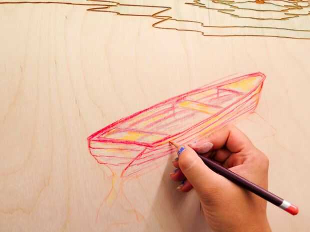 - Dibujo con lápiz sobre superficies planas y el sombreado solamente con el grano de la madera para lograr gradaciones sutiles.