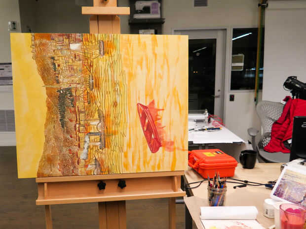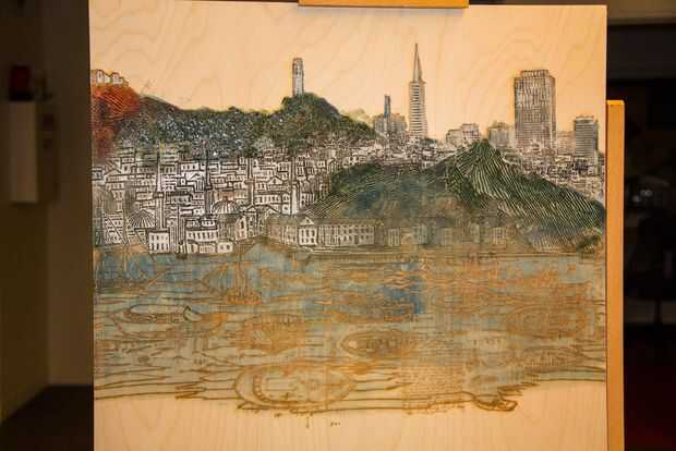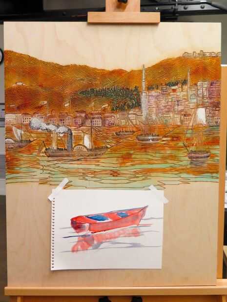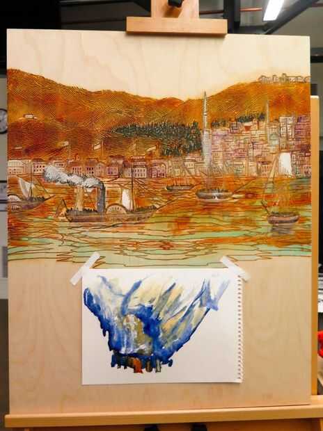 Tocó el violín con el láser de corte Brocas primero mientras pensaba qué hacer en el primero plano. Una vez que algo está en movimiento me parece que cambian mis ideas sobre lo que quiero que suceda. Me gusta imprimir fotos soy va a trabajar y moverse para tener una idea de lo que quiero cosas para parecerse a. También hago bocetos rápidos para fijar en las pinturas cuando estoy tratando de decidir qué hacer o adónde cosas especialmente si yo estoy cambiando las direcciones.