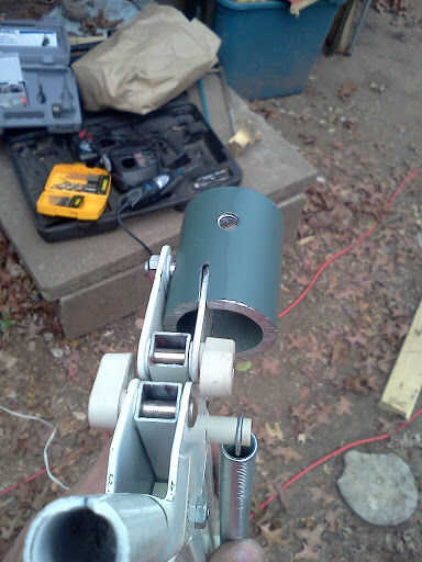 Aquí es donde mi error demostró para arriba. El agujero perforó era demasiado cerca de la parte superior del encaje, así cuando le pongo la articulación, interfirió con la tapa e hizo imposible apretar la articulación. Tomó aparte, montar la Junta marcada una línea de separación y desmontar la articulación, vuelva a colocar la toma en el brazo de manera que permita suficiente espacio, marcó un punto para el nuevo agujero y perforado.