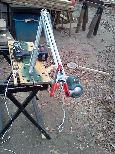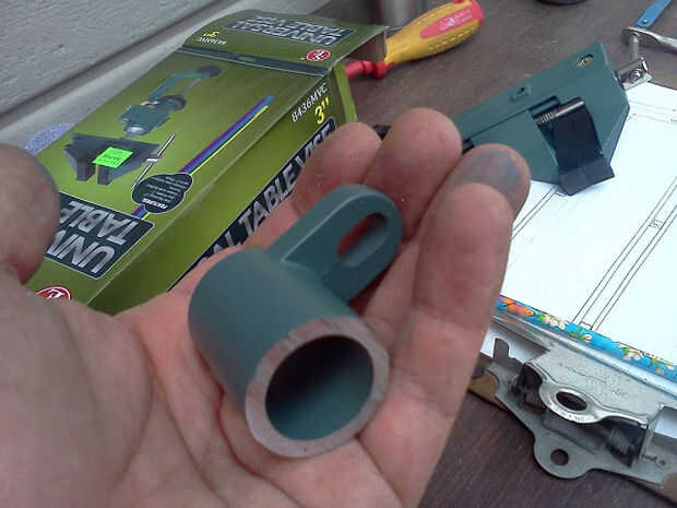 La abertura no era suficientemente ancha como para admitir la mandíbula de chapa, así que utilicé mi herramienta Dremel para cerdo hacia fuera. El accesorio era un poco quitar lechada que hizo brevemente el trabajo de la toma de aluminio. Una vez que se amplia bastante, resbaló en su lugar, marcada un punto para mi agujero y lo perforado.