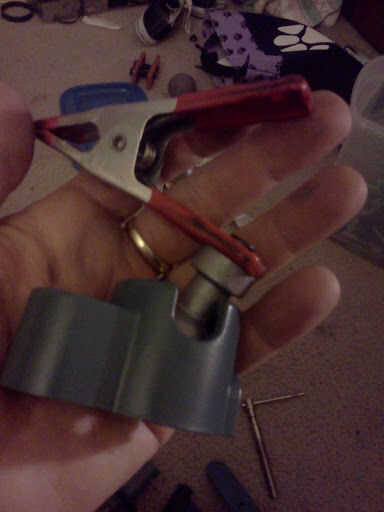 Luego lo pongo juntos, un proceso incómodo puesto que el perno de carruaje no tiene ninguna ranura de tornillo, lo que significa que tenía que tener la tuerca en el exterior. Por suerte había suficiente espacio para poner el tornillo en un lado, deslice el conector en su lugar, mueva el tornillo por el agujero de la toma y la segunda mandíbula y luego coloque la tuerca.