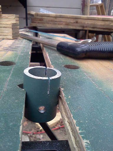 Un lado de la base se deslice entre las mordazas en la parte superior de la hacer pivotar-brazo a corta distancia. Pensé en taladrar un agujero e instalar allí, pero estaba demasiado cerca del borde del encaje para mi gusto. Regresé a la sierra hacia fuera y corte una hendidura perpendicular a la base del encaje. No haber planeado bien, elegí una profundidad arbitraria de la anchura de mi hoja de sierra. Esto fue un error, como veremos en un momento.