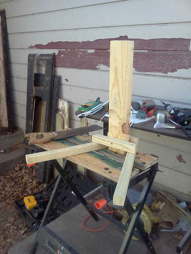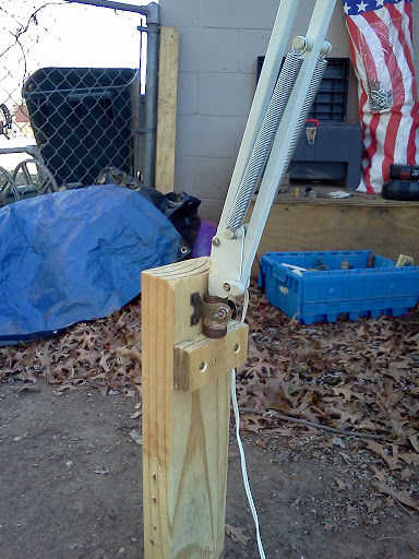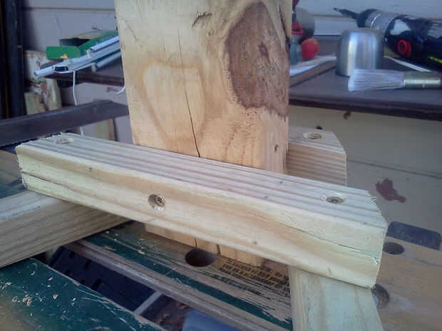 Pensé en taladrar un agujero en la parte superior de la 2 x 4 para aceptar la clavija en la parte inferior del brazo del oscilación, pero temía que desgastar y dividir con el tiempo. Además, la clavija fue ligeramente más grande que mi broca más grande.