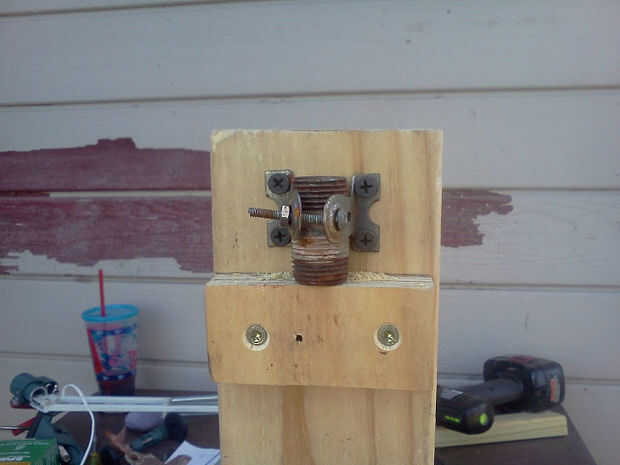 Que cavaron a través de algunas cajas de basura y encontré que la clavija de ajuste en una boquilla de pipa con bastante juego en el que gira suavemente. Caza de hardware más rindió dos soportes para mantener las persianas de rodillo y un perno y la tuerca que los agujeros de los soportes. Montara el pezón con un bloque de tope de madera contrachapada en la parte inferior, los soportes laterales y el tornillo apretando las abrazaderas firmemente contra el pezón. Si habia fijado la boquilla a ras con la parte superior de la base, el brazo podría han girado un completo 360 º. Yo no quería eso, porque sería desequilibrado con el brazo extendido hacia la parte posterior de la base. Decidí poner la boquilla inferior, para que el radio del brazo era limitado. En la práctica, ha desequilibrado todavía un poco con el brazo hacia un lado u otro. Puedo añadir más bloques de la parada más adelante para limitar el radio de giro a 90 º.