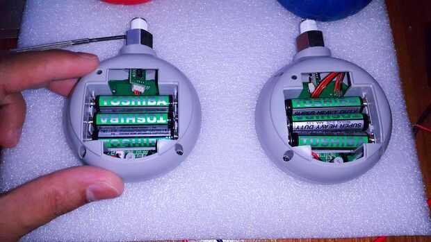 Cada uno venía con 3 pilas alcalinas aaa. Odio estas células ya que son propensos a fugas del electrólito en condiciones de alta temperatura.
