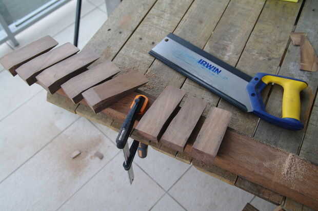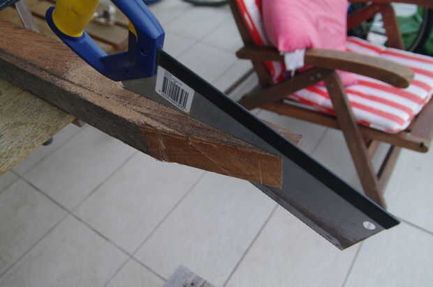 He utilizado un trozo de madera de construcción que recogió de otro sitio de la demolición. No estoy seguro de qué tipo de madera es, pero es muy difícil. Cortar con una sierra de mano fue algo de trabajo pero lo recomiendo para un trabajo limpio y preciso. Usted puede probablemente ir más rápido con una sierra de cinta si tiene uno. No recomiendo usar una sierra circular en todos para esta tarea.
