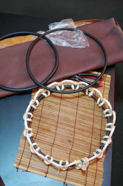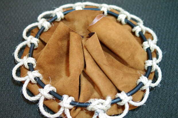 Primero, utilicé una segunda pieza de cuerda para atar los lazos de anillo superior con los cordajes principal (yo esperaba que simplemente pude deshacer este uno y las clavijas para poder rehead con piel real sin perder el ropework todo)