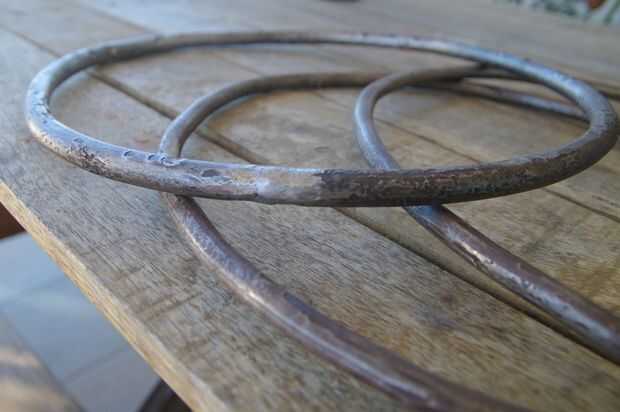 Para ajustar el tamaño del anillo, en mi caso que tuve que reducir el diámetro, he utilizado un martillo + pieza en forma de U del truco de la viga. Por martilleo abajo de una sección, la viga en forma de U obliga el anillo para convertirse en la más pequeña. La varilla de 12mm espesor fue elaborada de esa manera. Tomó tiempo, pero funcionó.