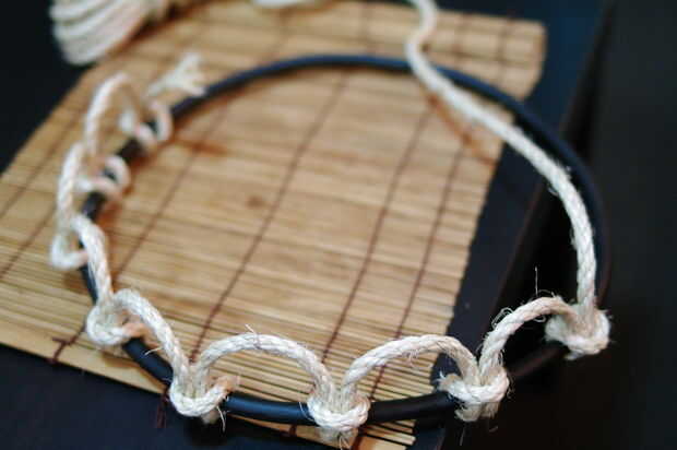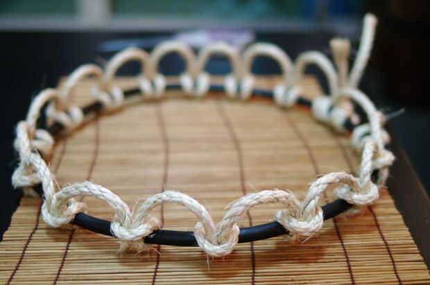 A partir de ahí, teje un segundo diamante usando el último trozo grueso de cuerda sissal que había comprado, terminando el tejido alrededor de la manija y agregar algunos más de la base lazos luego envolver alrededor para hacer una apropiada de la manija. Luego até a los restantes extremos sueltos detrás de los cordajes de mango.