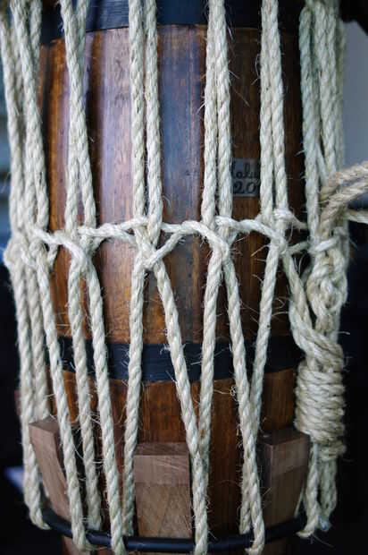 La tensión se consigue con cuerda en lugar de utilizar un tercer anillo colocado hacia la parte inferior del tambor y mantenido en su lugar con las clavijas. Las clavijas también pueden ser martilladas abajo, tirando así la tensión del anillo más abajo y por lo tanto también tirar (a través de las cuerdas) el anillo superior que convierte en presiones el segundo anillo superior y la piel hacia abajo alrededor de la cabeza.