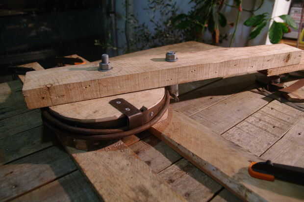 Mina está usando un disco grueso central de madera, reforzados con una tira de metal atornillada en su lugar. El disco fue construido para el tamaño de los anillos que necesitaba (de 26cm). Más tarde descubrí que yo debo han hecho 2cm más pequeño todo, como el metal expandió mucho después de doblarla.