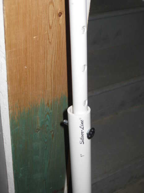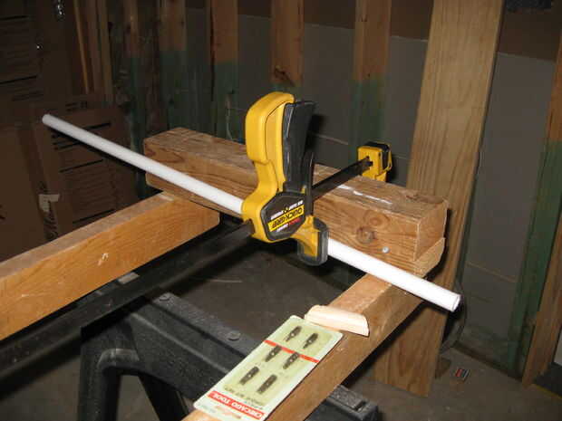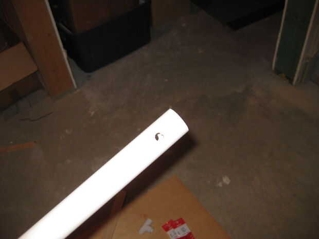 En primer lugar, tomar el tubo de PVC de gran diámetro y medir y cortar para que tenga un segmento de 32". Luego perfore un agujero a través del tubo hacia la parte superior. Esto será para el perno de carruaje que se ajusta la altura del soporte. Encontré una especie de agujero de perforación con una broca pequeña hecha fácil alinear la broca más grande.