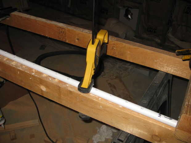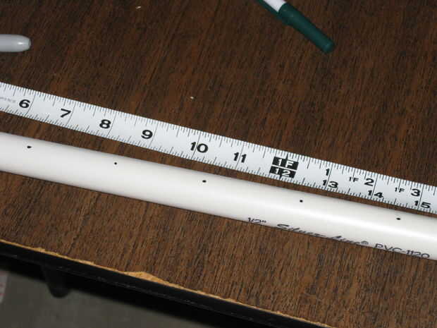 Ahora tome el diámetro PVC y corte a 32" así. Ahora marque cada 2" hacia abajo el tubo y perforar con la broca mismo utilizada para el solo agujero en la tubería de PVC más grande.