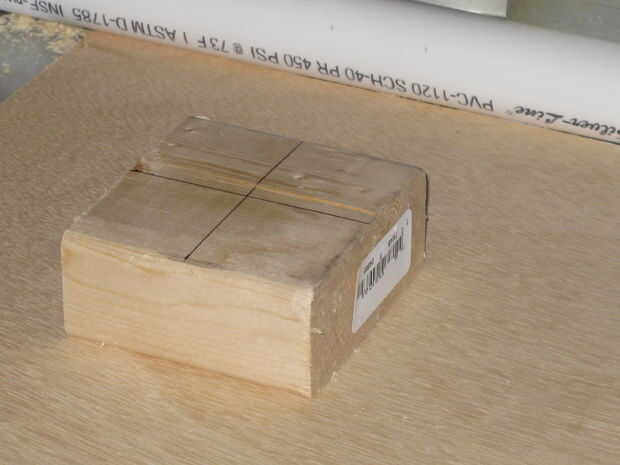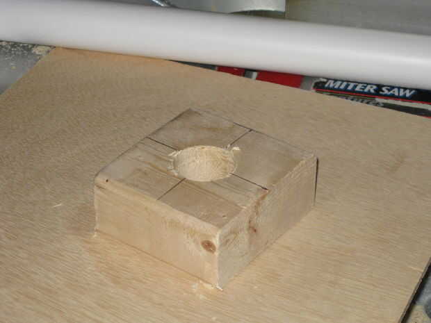 Marcar el centro del bloque de 2 x 4 y usar el agujero de 1 1/4" para hacer un conjunto de bits a través de todo el camino. Probablemente vas a tener que mover el taladro en el agujero para hacer el agujero un poco más de 1,25 pulgadas que se adapta a los tubos de PVC de mayor diámetro interior.