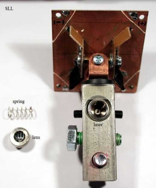 Donde la cinta adhesiva termina medida 4cm y cortar el resto de los cables. Inserte el láser para el aluminio cuadrado o barra de acero para la óptica están fuera de la barra y apriete los tornillos de M4 para fijar el láser. La soldadura de los extremos a la Junta (A) asegurándose de que el positivo del láser ir al positivo de la batería y están en el mismo lado. Continuar soldando los polos negativos.