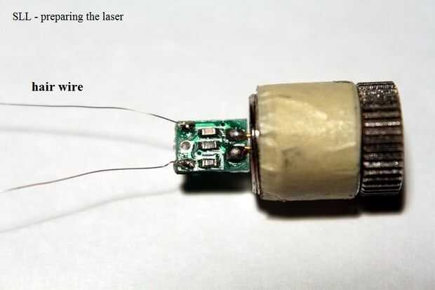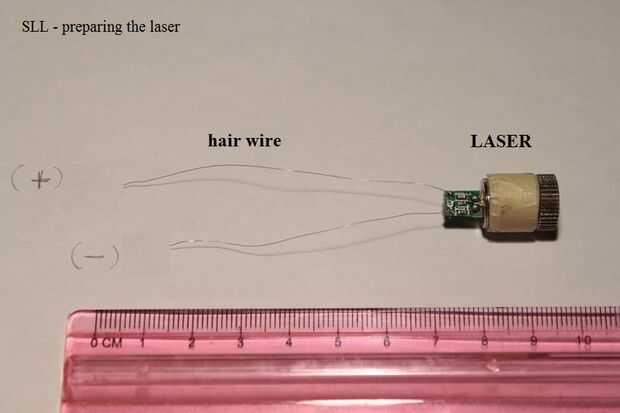 La desventaja de utilizar el último método es que los cables podrían consiguió cortar en tiempo. También, misma resistencia ohmios está presente porque son cables muy delgados pero mis medidas con el láser como sucedió con él es mostrar cables propios que dibuja 14.7mA en 4VDC en vez de 14mA en 4VDC utilizando el hilo de pelo de cable del altavoz. Así 0.7mA no son críticos para el funcionamiento del láser.