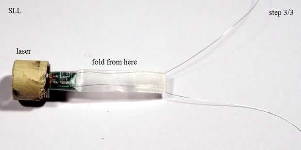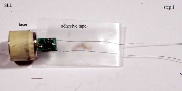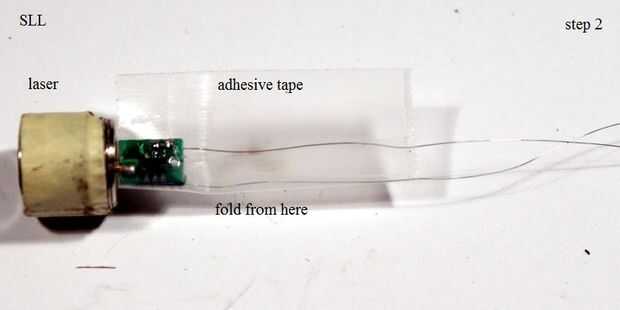 Retire la cubierta protectora del láser y desoldar los cables. Asegúrese de recordar la polaridad. Tome un cable de altavoz y quitar el aislante. Tomar dos trozos de alambre fino del cable a unos 10cm y soldarlos a los polos positivo y negativo del laser. Utilice cinta adhesiva para cubrir el láser PCB y los cables de unos 4cm de largo asegurándose de que no son en contacto entre sí.