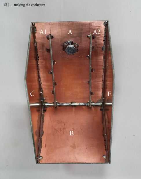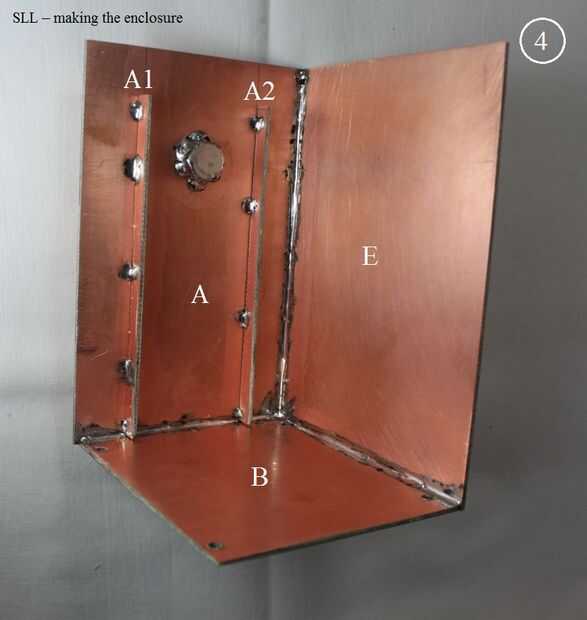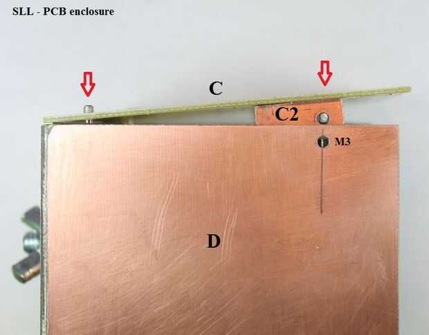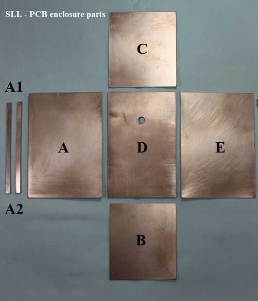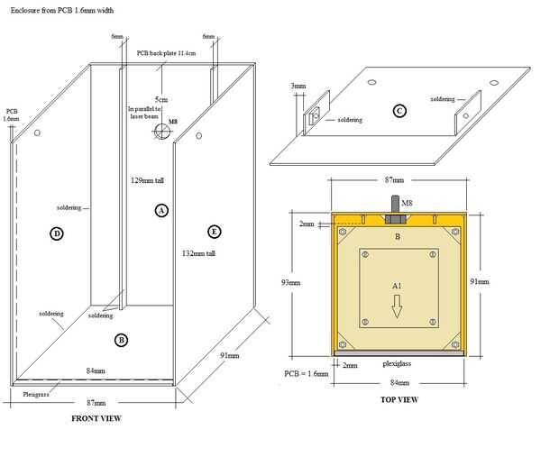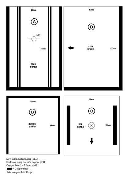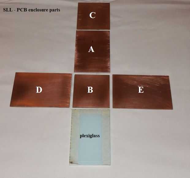 Hay tres dibujos dándole las dimensiones y también mostrando cómo montar la caja. Aunque tomó todo el esfuerzo para dibujar las piezas tan precisas como sea posible, por favor contar con sus propias medidas al cortar las placas PCB.