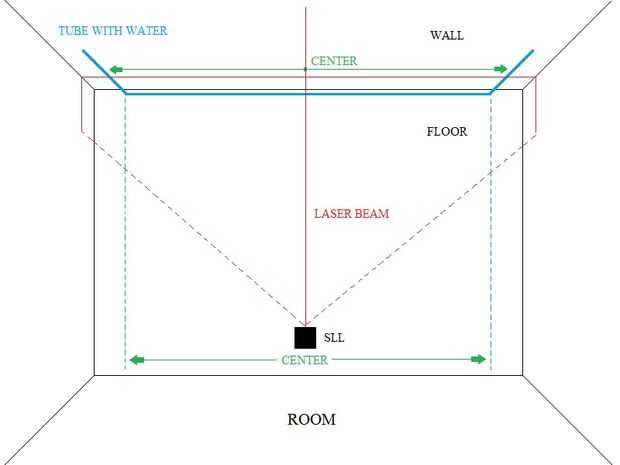 Mueva el otro extremo del tubo como puede ir y levante el extremo en el mismo nivel con el fin de colocar en la pared. Coloque el aparato sobre una superficie estable y traer un extremo del tubo frente a la SLL así parte de los golpes de rayo láser de Dónde está el nivel del agua. Asegúrese de que parte del rayo laser golpea el nivel de agua del tubo de pared.