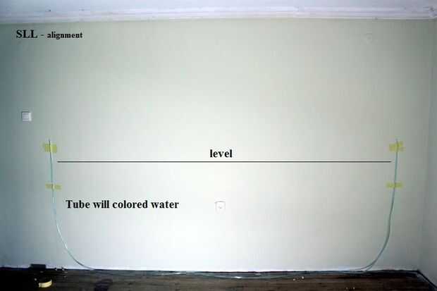 Correr agua en un tubo hasta que esté casi lleno. Sujete un extremo en el lugar para que el nivel del agua está a la altura deseada y tomar el otro extremo a donde tiene que marcar una línea guía en el mismo nivel. Los niveles de agua en cada extremo del tubo estará siempre en exactamente la misma altura.