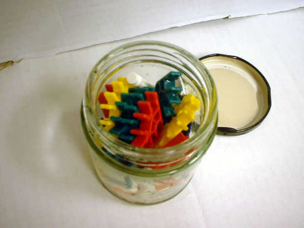 Piezas de K'NEX fueron arreglados en la jarra de mermelada, con pensamiento para balance de color y la estética general. No sólo mezclar a K'NEX en un tarro. (OK me hizo lanzamiento justo K'NEX en el tarro, pero no se ven bien así con puntas hacia fuera y comenzó otra vez)