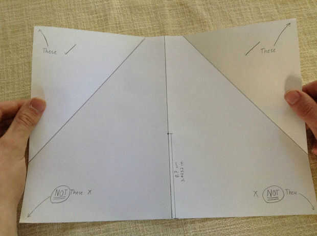 Doblar las esquinas anotadas que son más lejos hasta el punto que marcaste en el paso 2. No los que más cerca el punto como se muestra. Mantenga simétrica.