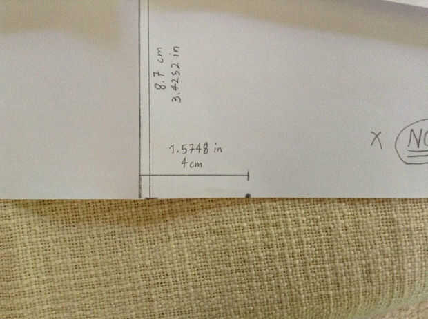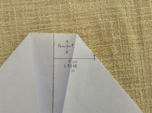 Medida 4 cm (1,5748 pulgadas) desde el primer doblez que hiciste, como se describe en el cuadro. Hacerlo para los lados opuestos, como vas a doblar a lo largo de allí y que sea paralela por favor. Se puede medir de ambas alas, pero no es necesario.