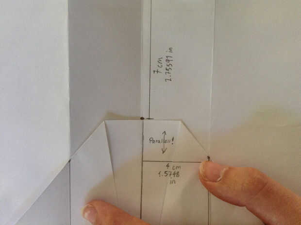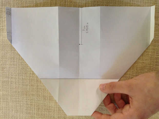Doblar la parte delantera del punto papel aeroplano a eso 7 cm (o en 2,75591). En general, aunque 7 centímetros es el largo se debe doblar por lo menos, pero para hacerla volar más estable, o en el caso tuyo puestos, veces más material en la parte delantera para que menos que el espacio ha marcado en paso 7 (7 cm) a la parte posterior están presentes.