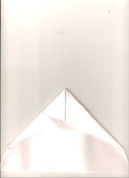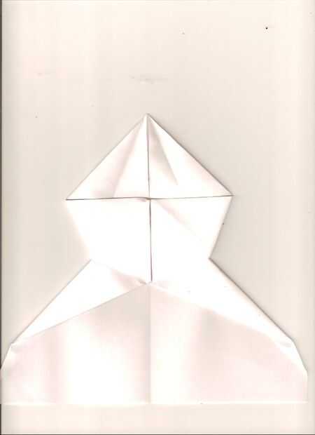 a continuación, voltee el papel y doblar la espalda delantera hasta que el punto está justo al final de la espalda. Girar de nuevo y luego doblar las esquinas al centro. Y girar de nuevo y doblar el canard. Para hacer esto simplemente tome los dedos y pegarlas en las aletas y extensión. Esto es muy unexplanetary en internet. Tratar de hacer tan grande como sea posible.