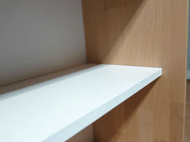 -Añadir tus estantes. Opcionalmente y si es necesario, pintar los bordes frontales blanco.