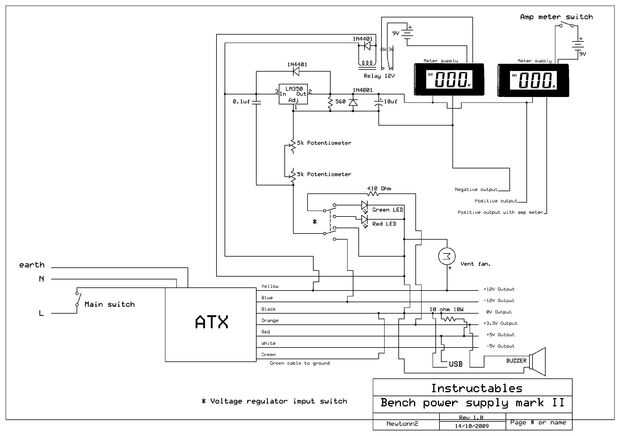 En el esquema verás cómo he utilizado el doble interruptor de dos vías para intercambiar el cable negativo que va en el regulador de voltaje. Puedo usar éter-12v o 0v (tierra), la razón por la que he hecho esto es porque el - 12v no es tan potente como la salida de 0v. Con ajuste 1) puede ir de 1.2V a 23V, pero se limita a 2A y con ajuste 2) puedo ir de 1.2v a 11V hasta 3A (el regulador de voltaje es 3A) aquí es un vídeo usted puede ver la diferencia: