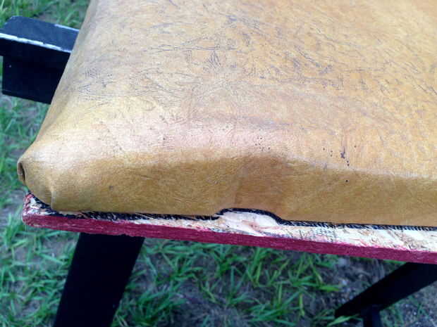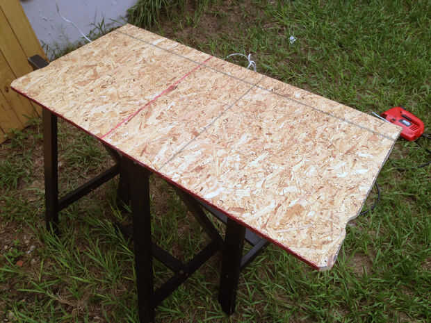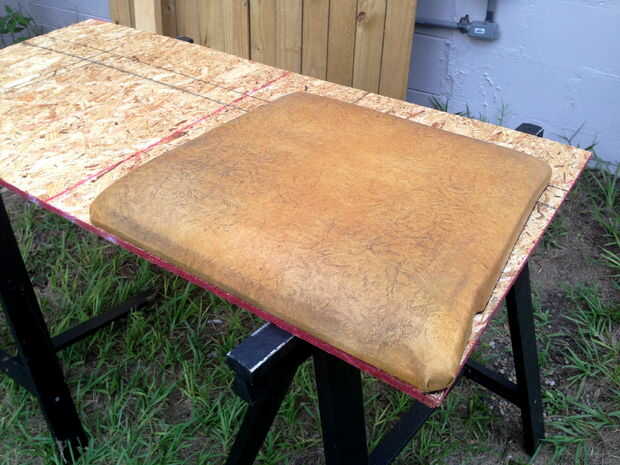 Mientras que el aceite es penetrar en la madera (o mancha o lo que sea), manos a la obra haciendo el asiento. Mida de su viejo asiento Amortiguadores delantero y marque una línea de sharpie grande a través de un trozo de madera que sea lo suficientemente grande como para cubrir el área entera del asiento. Medir a través de la parte posterior de sus sillas y marcar la profundidad del asiento en la madera con el rotulador.