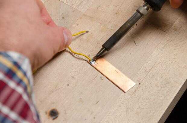 Tira el otro extremo de los cables y soldar los extremos en las piezas de metal. Dependiendo de qué tipo de metal se utiliza podría ser una buena idea utilizar flux para soldar.