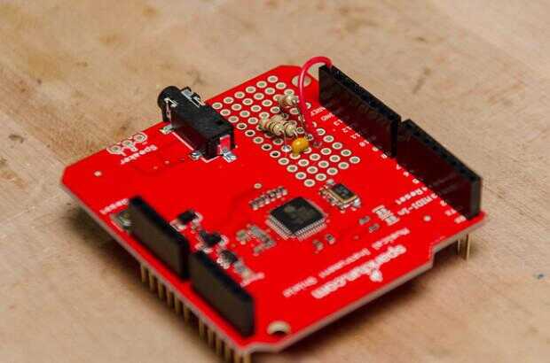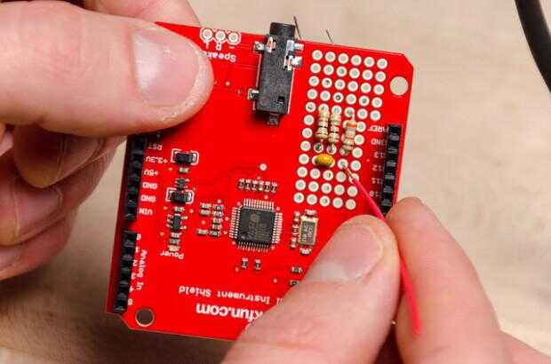 Doble hacia abajo la pierna de R1 (el lado no conectado a R2) y soldar el cable rojo.