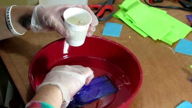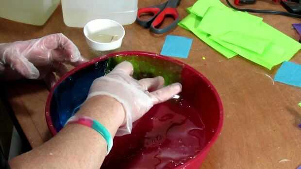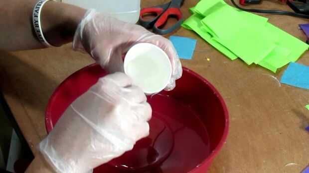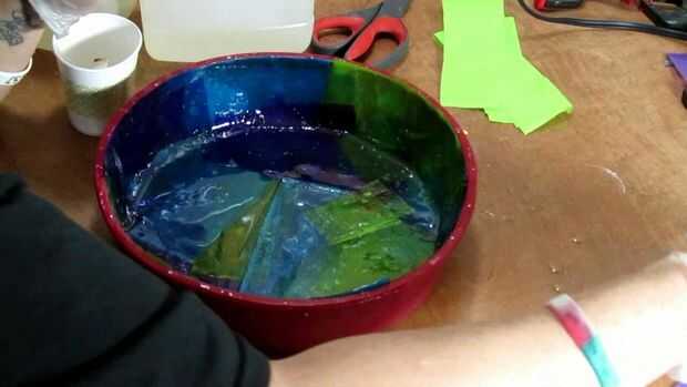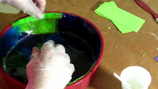 Comenzamos vertiendo algunas resina en el molde. Luego había empapada al azar trozos de papel de seda en esa resina y comenzó a construir una pared en el molde. La resina hace que este muy pegajosa y tiene al lado muy bien.
