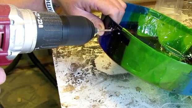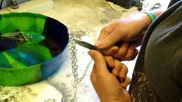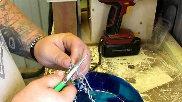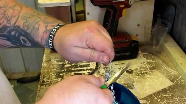 Una vez que tuvimos las longitudes que queríamos, hemos perforado tres agujeros espaciados uniformemente alrededor del perímetro de la placa de 1/2" por debajo del borde. Luego nos puedan abrir el último eslabón, corrió a través del agujero y conectados juntos. Hicimos lo mismo para todas las longitudes de tres.