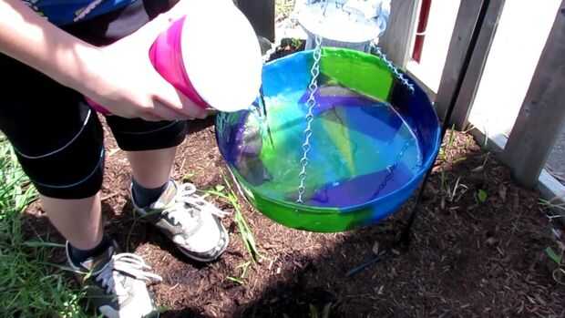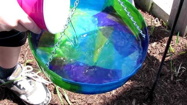 Utilizando la resina y el papel de tejido podría ser bastante creativo con los colores y tal vez incluso añadir en algunos diseños. Hasta ahora, las aves han disfrutado y los agujeros de drenaje han trabajado muy bien, manteniendo se desborde. No ha habido ningún pájaros grandes en él, por lo que no estamos seguros de cómo el peso de ellos afectará el equilibrio, pero las aves más pequeñas parecen estar bien.