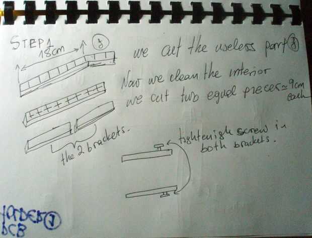 Desde que tenía sólo un soporte que decidí cortarla. Este soporte después de 3 cm doblado en un ángulo de sobre 10degrees. Corté los primeros 12cm y guardé la otra 18cm. La segunda parte no fue doblada con un encendedor que doblado exactamente como el...