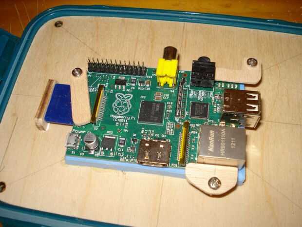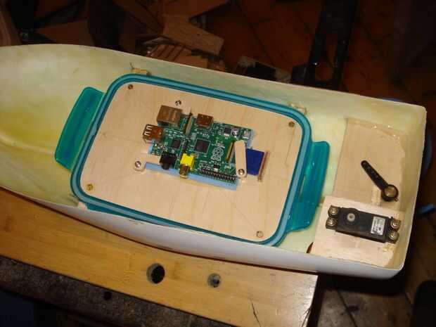 Corte y en forma de un tablero de madera contrachapada que descansaría dentro de la tapa. Todo el conjunto está atornillado a dos travesaños fijados dentro de casco de POCV. Los clips laterales fueron quitados de la tapa para que la Asamblea pueda sentarse más bajo en el casco. En el panel de madera pegué una almohadilla de espuma, de un Yoga mat, que la frambuesa Pi se encuentra en y tres soportes de la Raspberry Pi en posición. Con la tina, ahora recorta la tapa, en lugar el recinto es completamente hermético. Por ahora de todos modos!