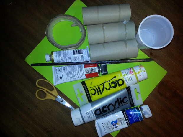 lo que usted necesita: 1 hoja de papel de colores 3-4 papel higiénico papel (emtey) cinta de enmascarar (cinta normal no funcionará) palo de polo scissores Si quieres a color utiliza pintura y todas las otras cosas para la pintura pegamento