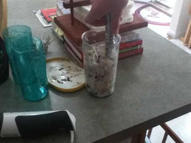 Hoy voy a mostrarle cómo usted puede hacer un batido delicioso!Las cosas que usted necesitará:Una botella deUn refrigerador o congeladorUn pedazo de papel o un embudoLos ingredientes:4/5 de taza de leche3/4 de taza de polvo de capuchino1 cuchara de p