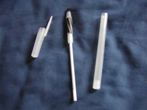 materiales: pluma tubo de goma, cinta, pinchos, tapasProcedimiento:1. Tome un tubo de lápiz, hacer tomando un bolígrafo y división aparte.2. Coloque una banda de goma hasta el final del tubo de la pluma, taping en.3. tomar una tapa e inserte en el ex