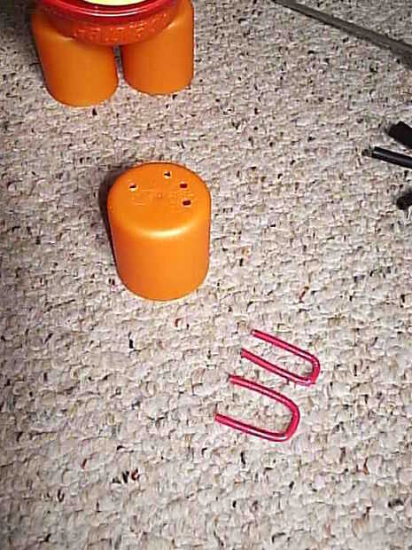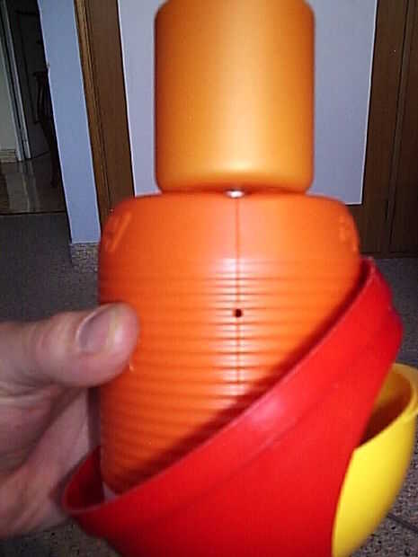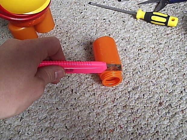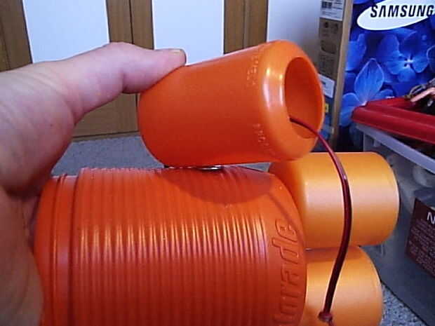 Momentáneamente pusieron la cabeza sobre el cuerpo para medir la posición exacta de los brazos. Trabajar con un bote de Gatorade tiene una gran ventaja: no necesita una regla, porque el bote es convenientemente demarcado. Así, si desea que el orificio izquierdo coincide con el derecho, sólo tienes que seguir los surcos.
