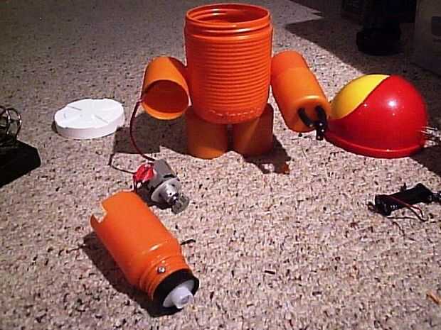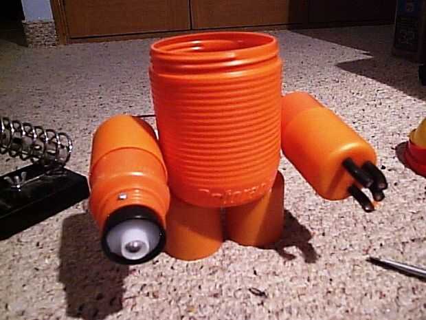 Después, conecte los cables de LED y los cables del motor a los cables rojos y negros que dejó el hombro al cuerpo, de la misma manera que el brazo izquierdo. Perfore un agujero en la tapa del desodorante para unirla al cuerpo. Encajar el bote de medicina en la tapa y fijar con tornillos.