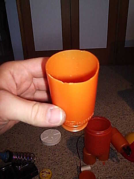 Contrario al brazo izquierdo, el hombro del brazo derecho está la tapa del desodorante de pies, y la parte delantera del brazo (el rayo) es del bote de medicina. En el brazo izquierdo (paso anterior) había que cortar la nariz de botella. Ahora en este brazo, la nariz de botella es el canon, y tienes que cortar la parte inferior. Si tienes alguna duda, consulte el cuadro "colocación de las piezas" en este paso, donde explico mejor.
